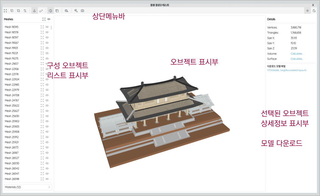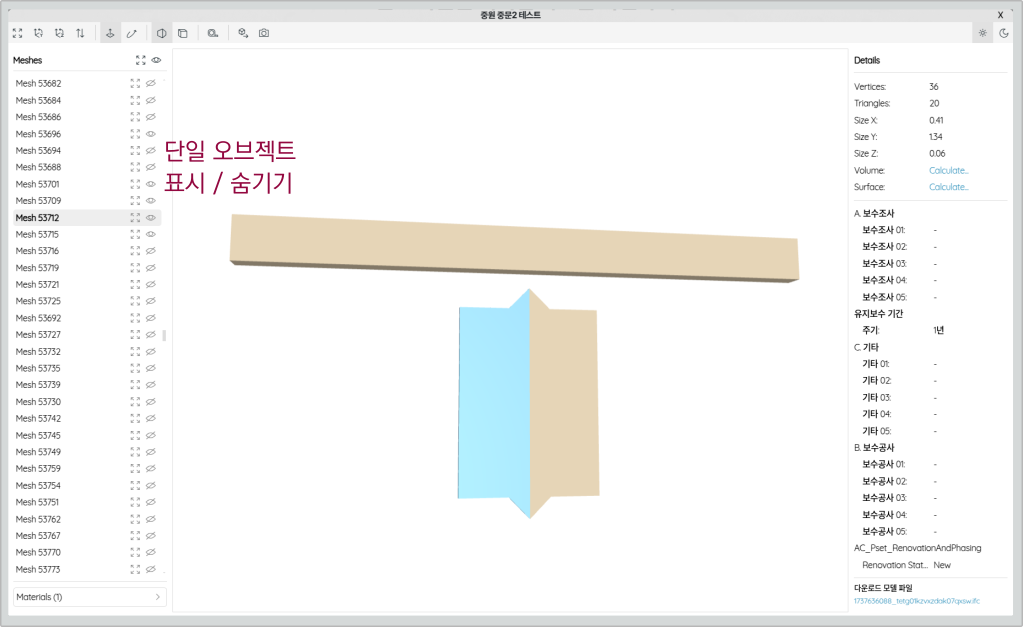 좌측은 전체 오브젝트를 구성하는 단일 오브젝트 리스트가 나열되고, 우측에는 전체 또는 선택된 오브젝트의 기본정보가 표시됩니다.