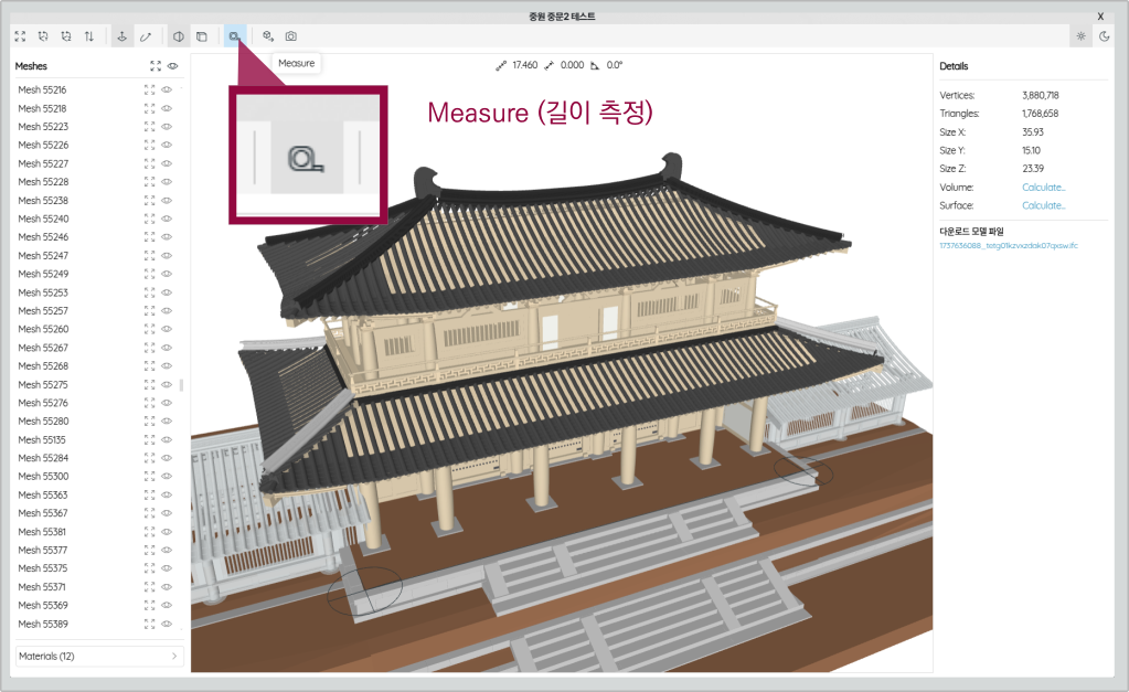 특정 오브젝트의 길이를 측정하고자 할 경우 상단 메뉴바의 Measure 버튼을 클릭합니다.